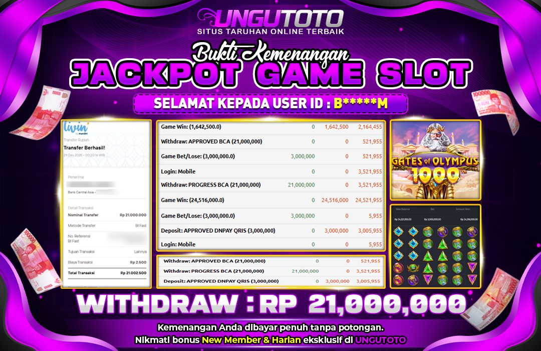 Selamat Kepada Member UNGUTOTO B*****M Telah Jackpot Di GATES OF OLYMPUS 1000
