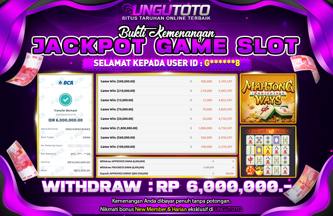 Selamat Kepada Member UNGUTOTO A*******N Telah Jackpot Di MAHJONG WAYS