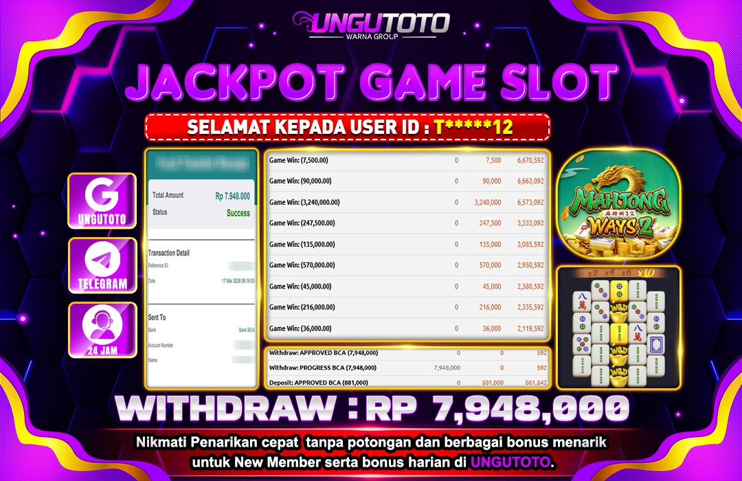 Selamat Kepada Member UNGUTOTO T*****12 Telah Jackpot Di MAHJONG WAYS 2