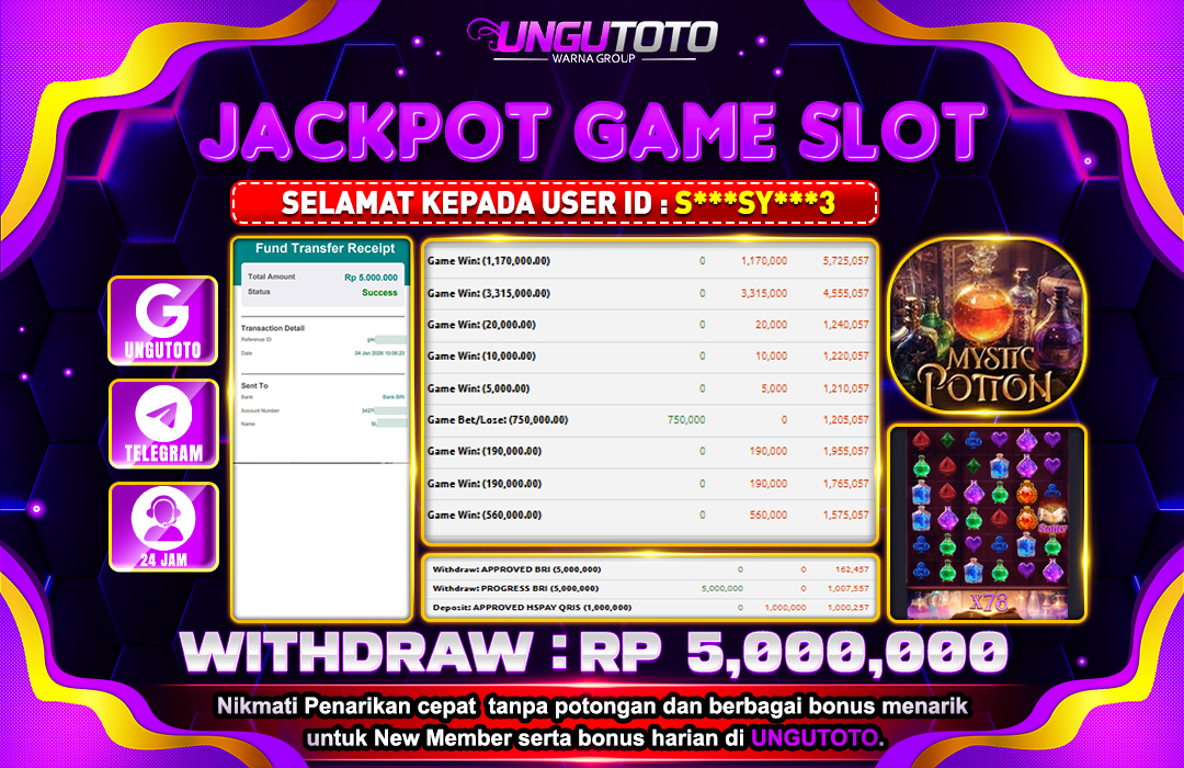 Selamat Kepada Member UNGUTOTO S⭑⭑⭑***��⭑⭑3 Telah Jackpot Di SLOT PG SOFT MYSTIC POTION