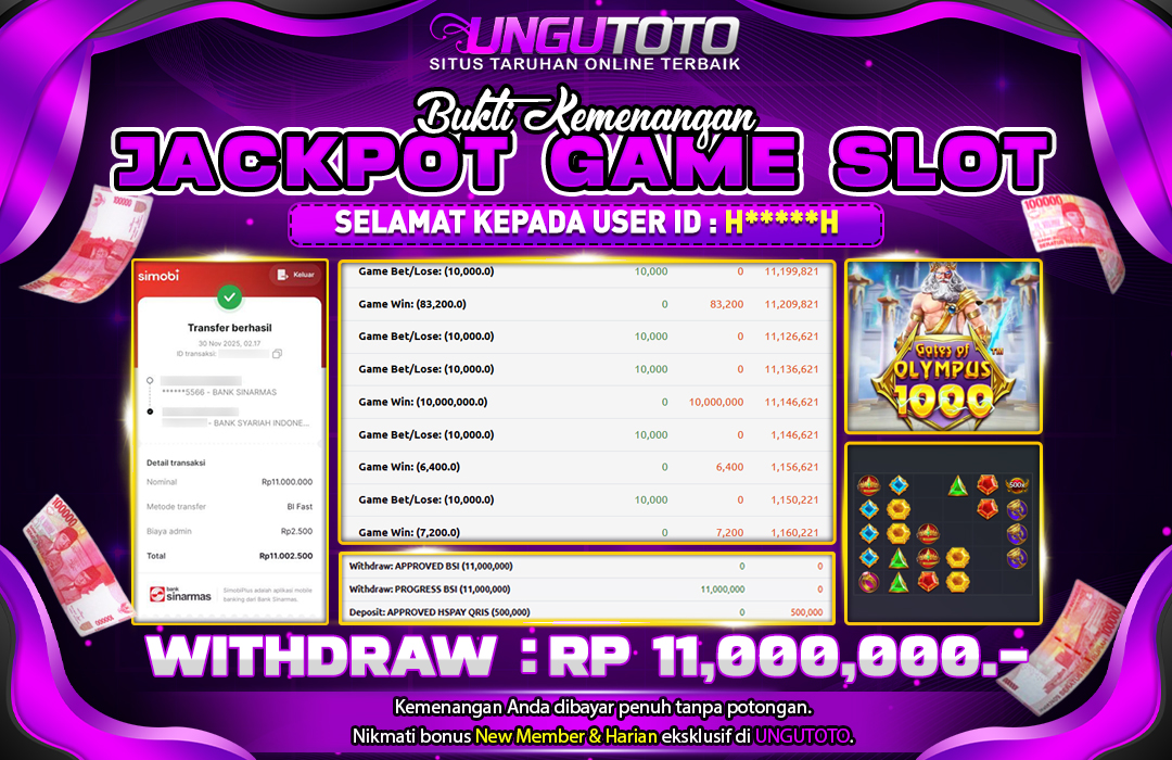 Selamat Kepada Member UNGUTOTO H****H Telah Jackpot Di GATES OF OLYMPUS 1000