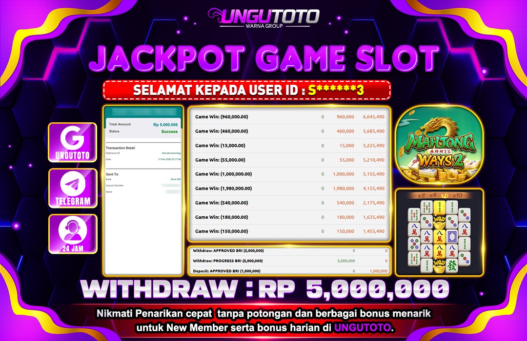 Selamat Kepada Member UNGUTOTO D********K Telah Jackpot Di MAHJONG WAYS 2