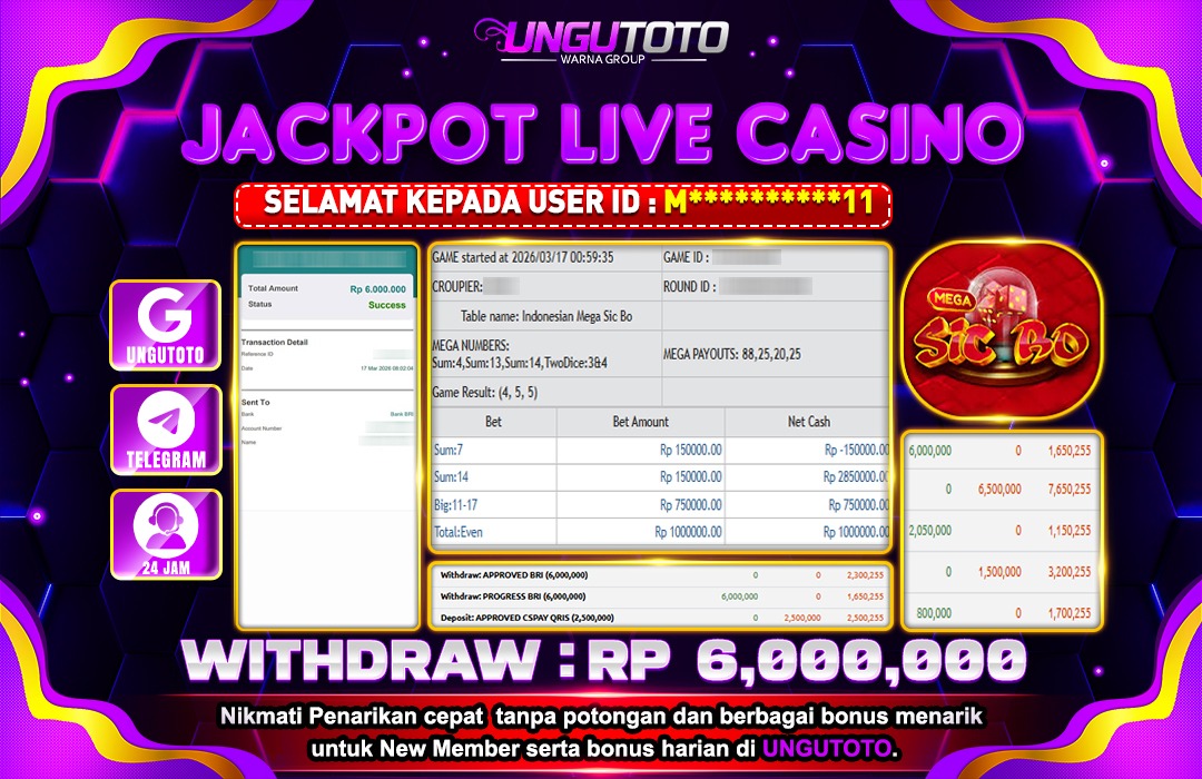 UNGUTOTO JACKPOT LIVE CASINO MEGA SIC BO Rp.6.000.000 LUNAS
