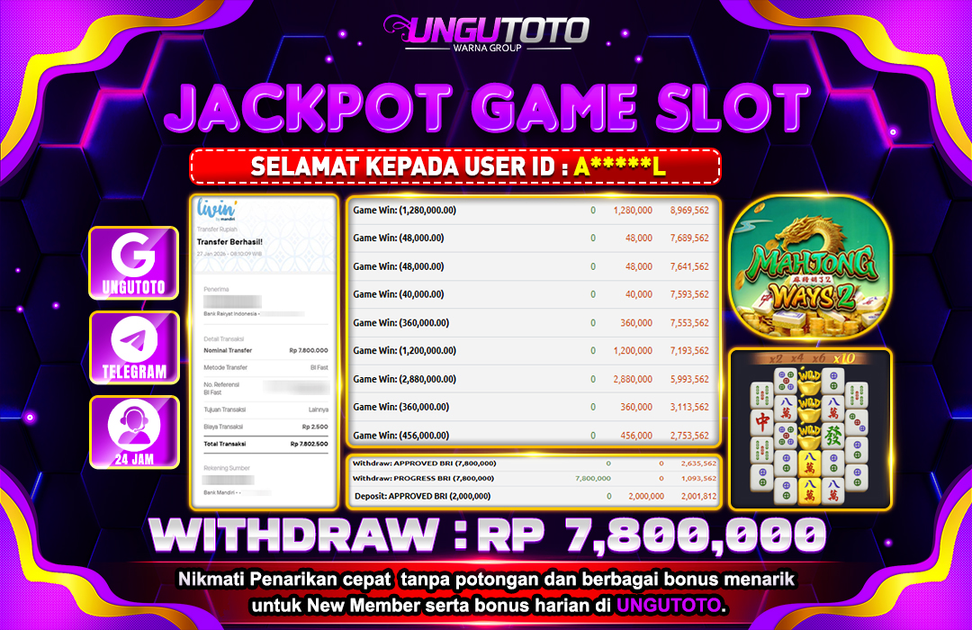 Selamat Kepada Member UNGUTOTO A******L Telah Jackpot Di MAHJONG WAYS 2
