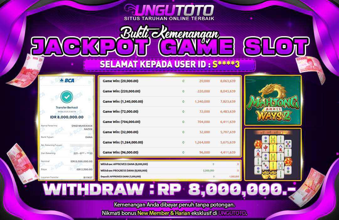 Selamat Kepada Member UNGUTOTO S****3 Telah Jackpot Di MAHJONG WAYS 2