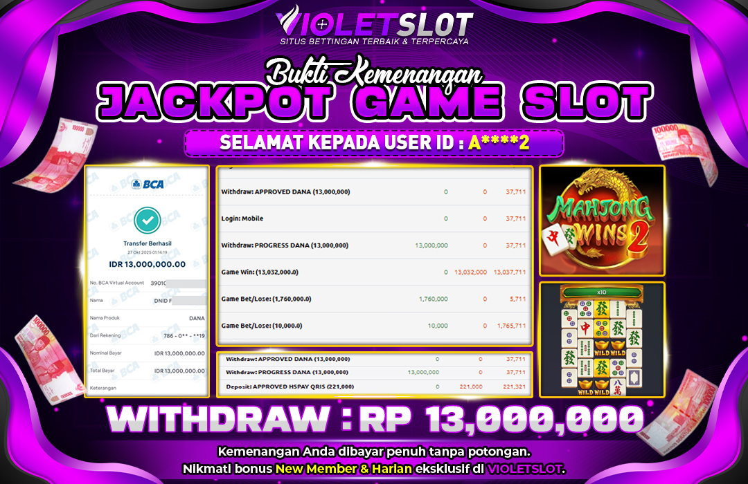 UNGUTOTO JACKPOT GAME SLOT PRAGMATIC MAHJONG WINS 2 Rp.13.000.000 LUNAS
